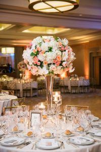 Alexandra & Edmond Wedding – High Centerpiece – Dahlias Hydrangea Orchids Eucalyptus Ranunculus Roses – Ritz Battery Park NYC – Photography by Sara Wight