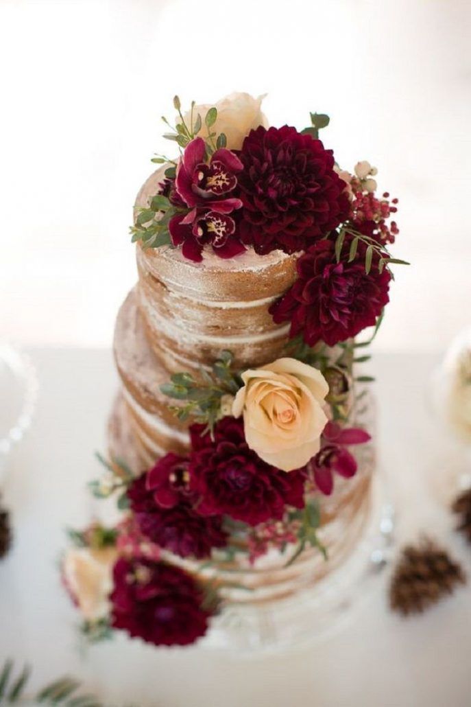 - Gold and Cranberry – Fall Naked Wedding Cake – Elegant Woodsy Wedding – via Brendas Wedding Blog.com