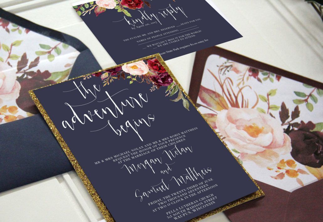 - Navy and Marsala Wedding Invitation Suiite – Wild Berry Smash Cocktail Inspiration – Unicaforma Shop – via Etsy.com