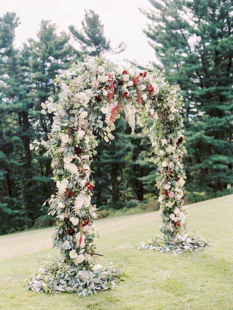 We always start by suggesting that our clients first consider the setting in which their outdoor ceremony is going to take place. If you are getting married at a venue known for its verdant grounds, is there anyway to tie these organic markers into the theme of your decor? A whimsical archway accented with blossoming arrangements looks splendid against an abundant forest. The timeless romance of a private countryside wedding is captured in an elegant floral and greenery ceremony arch. A white bloom and greenery chuppah draws from the quaint charm of its upstate New York farm locale.