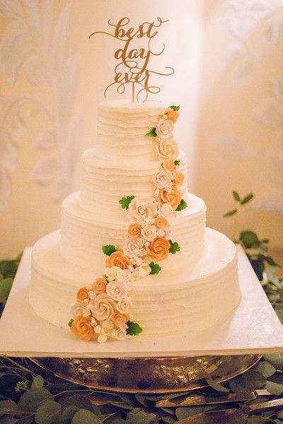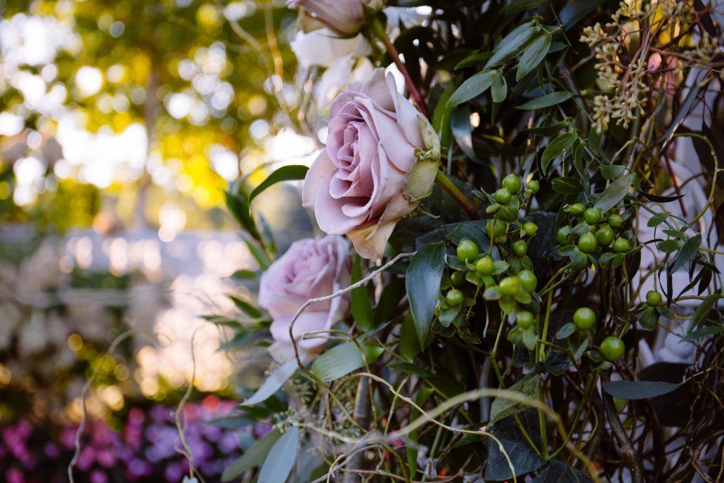 The couple said their vows before a beautiful floral archway accented with curly willow branches, ivory and cream roses, Italian ruscus and silver dollar eucalyptus. A whimsical walkway lined with roses led up to the altar with additional branches and greenery.