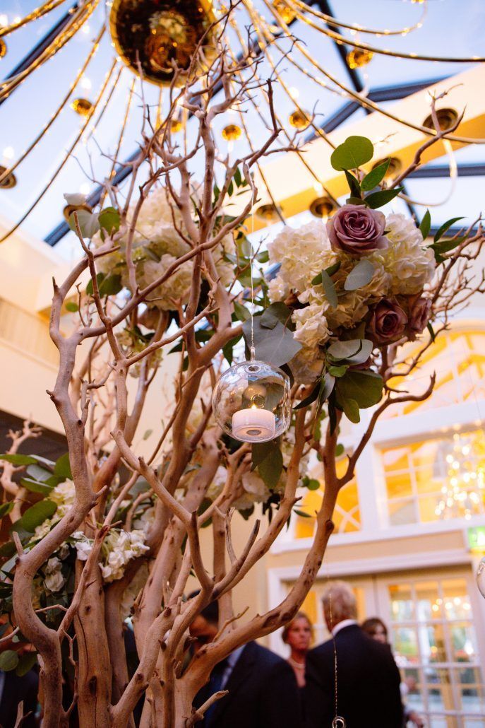 The reception was held at East Wind’s Estate, a breathtaking, modern hall with skylights, exposed brick, and brass chandeliers. Guests were greeted by two sandblasted manzanita trees rooted in a bed of fresh blooms and illuminated by floating glass votive candles.