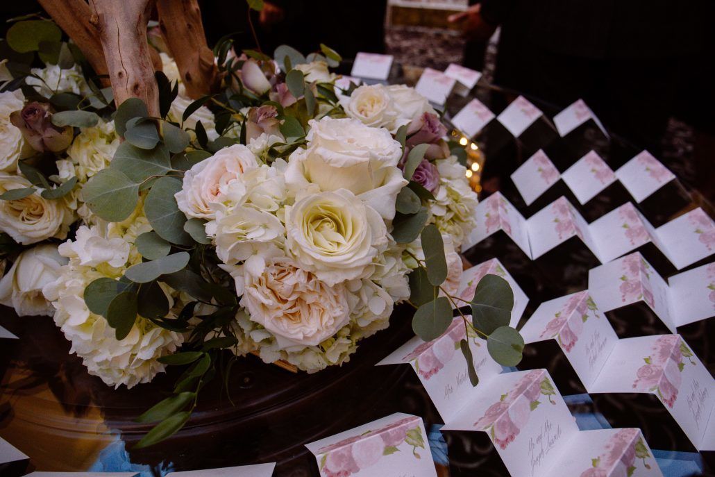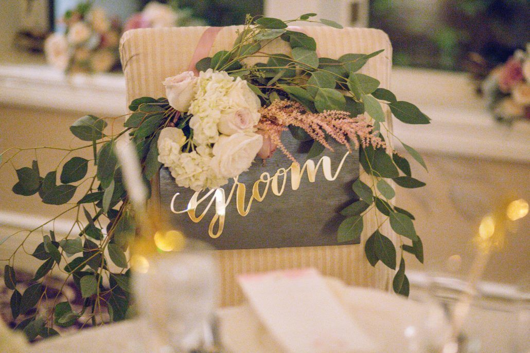 Creating a magical, Bohemian vibe in alignment with their serendipitous meeting , Alyson and Gary’s décor struck the perfect balance between wild and polished, subtle and bold. Tables were decked out in both high and low arrangements of roses, hydrangeas, dahlias, and tulips, with gold glass-stemmed candle holders bringing a romantic glow to the room. A floral garland was strewn across the couple’s sweetheart table, and adorable signs accented with fresh blooms and greens hung on the newlywed’s chairs.
