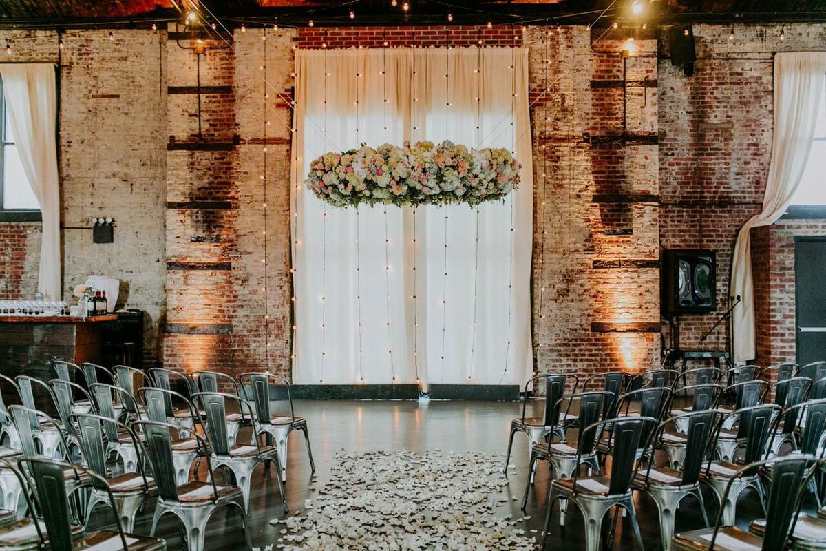 The Green Building had all the qualities Ashley, our featured bride and aspiring wedding planner, was looking for: an open, bare space offering endless creative options for styling and décor. “Wedding décor is constantly evolving,” says Ashley. “I feel like a great way to accentuate and bring romance and drama to a space is with hanging flowers. So I knew that I wanted a circle of flowers hanging over us.”