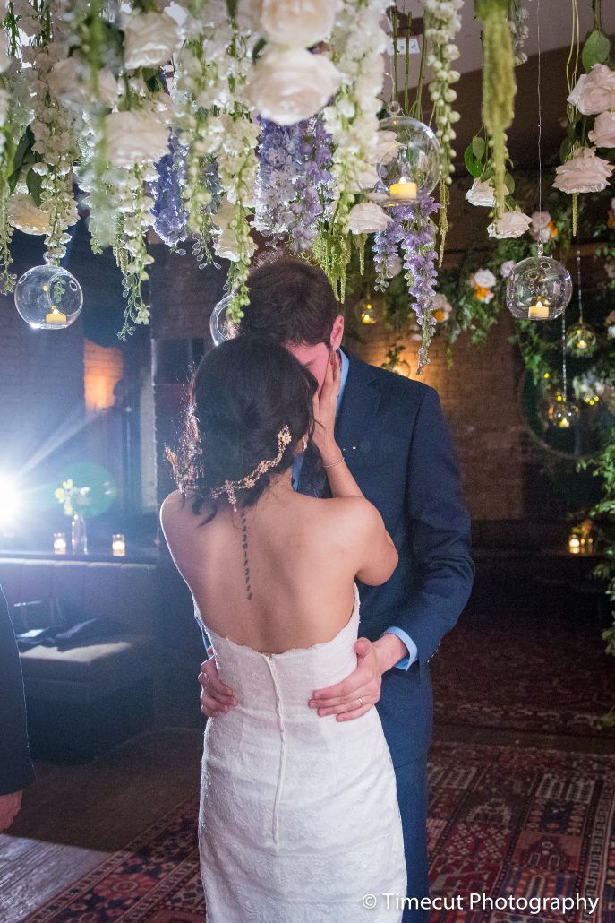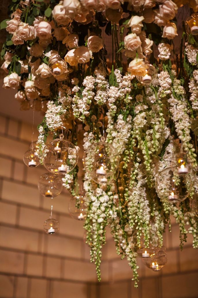 Don’t think it’s impossible to do hanging florals in smaller venues like a restaurant. Just look at this couple’s Acme restaurant wedding. Their first dance under a low hanging floral chandelier featuring white roses, stock, purple delphinium, amaranthus, and greenery with candlelit hanging glass bubbles must must have felt like magic!