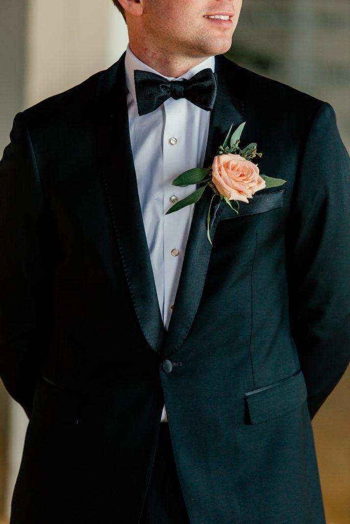 For a wedding at the Liberty Warehouse in Brooklyn, the groom wore a garden inspired boutonniere featuring a single Alejandra peach rose accented with seeded eucalyptus and wrapped with black ribbon.