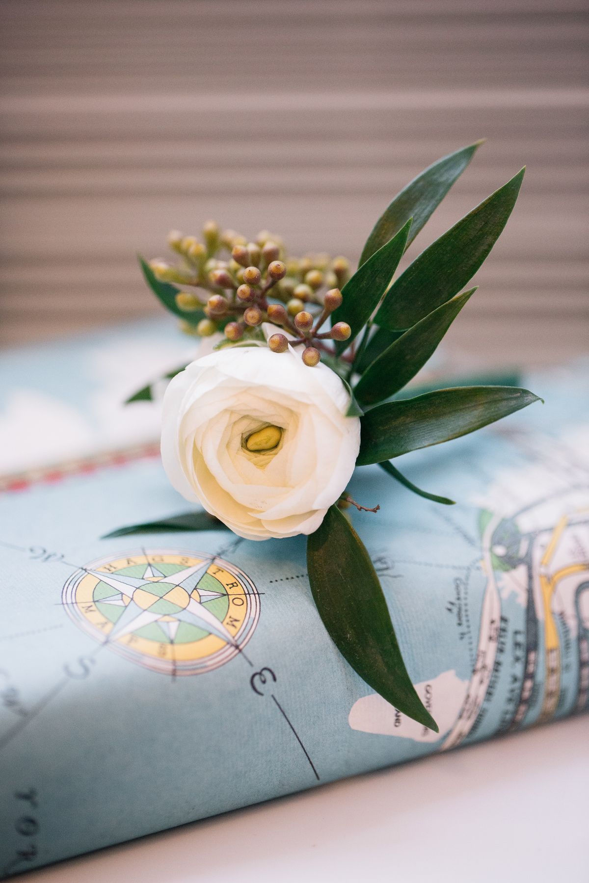 The contrast between the petite white ranunculus and dark greenery of this boutonniere portrayed a natural elegance that was just right for a wedding at the Alger House.