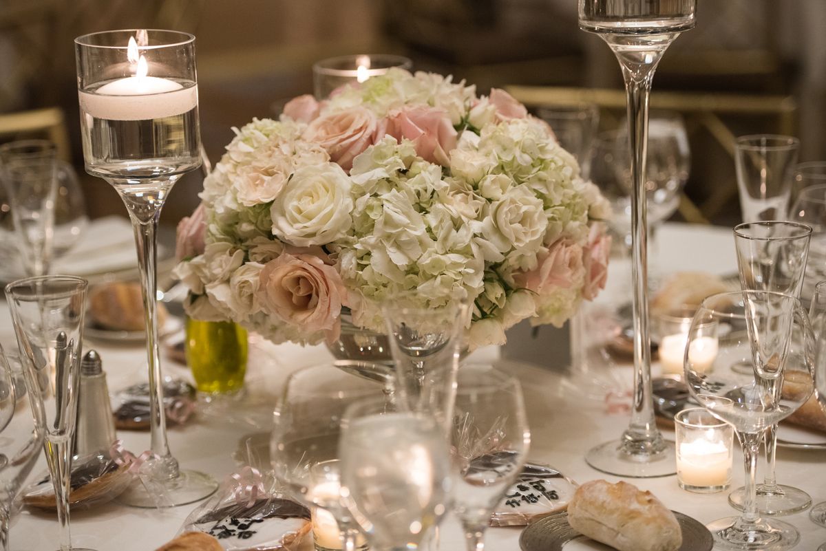 Gorgeous high centerpieces of white hydrangeas and blush-colored roses accented with tall, floating votives decorated some tables, while lower flower arrangements mixed with the same tall floating votives created transparent levels where guests would be seated. Overall, the mood was classic, chic, and 100% New York City bride.
