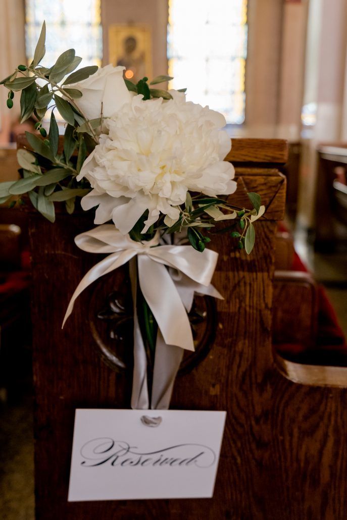 Aerin’s classic white and greenery theme was the perfect, subtle accent in such a magnificent ceremony venue. Lining the aisle, pew flowers were arranged in lush clusters of white peonies, and garden and Tibet roses with olive branch greens. Evoking a romantic, natural feel, stunning altar arrangements featured white hydrangea, garden and Tibet roses, peonies complemented by lemon leaf, Italian ruscus, and olive branch greenery.