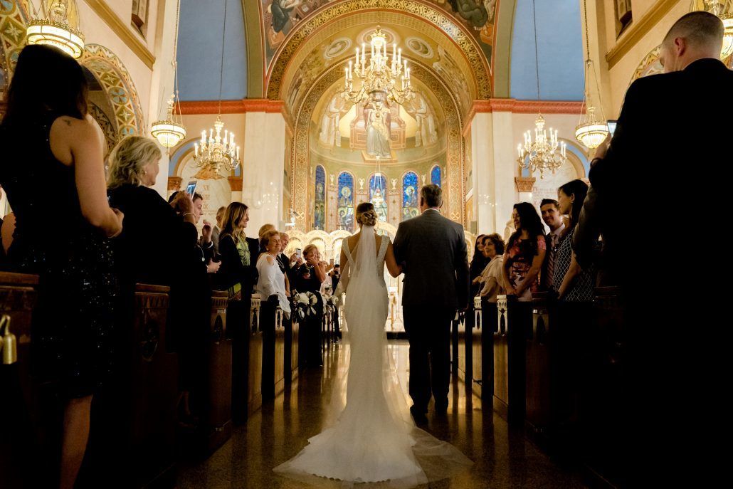 While many couples are choosing to have their ceremony and reception at the same venue, the couple chose a more traditional setting to exchange vows. It was very important to Aerin and Steven that they get married in a sacred space surrounded by those they love most. Aerin remembers, “All of our immediate family members and close friends were involved in the processional. We now have the best memories from that day.”