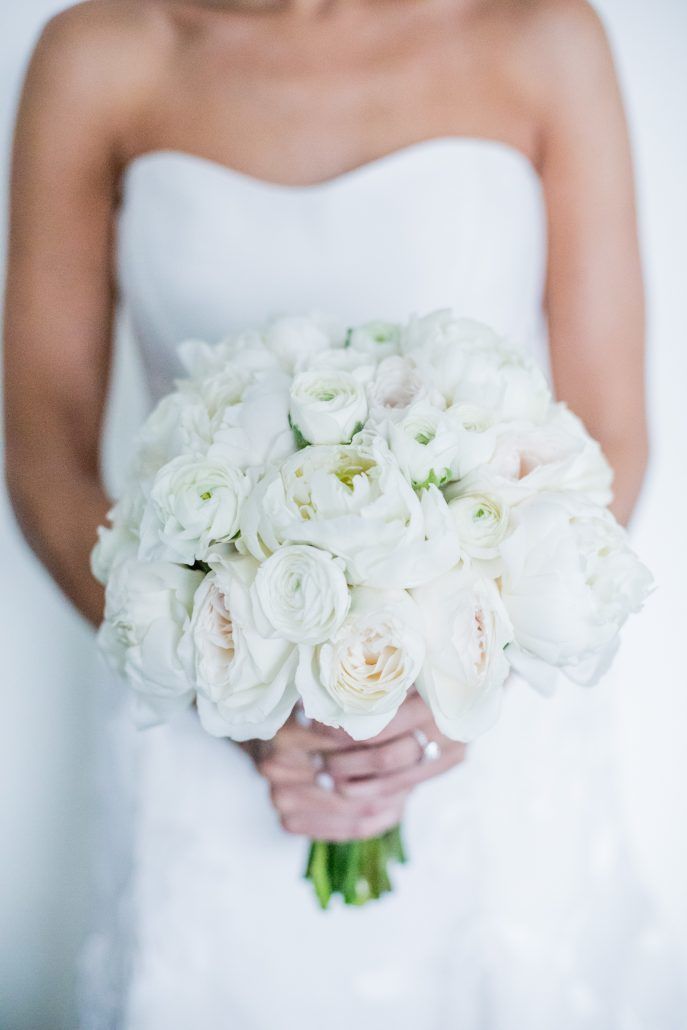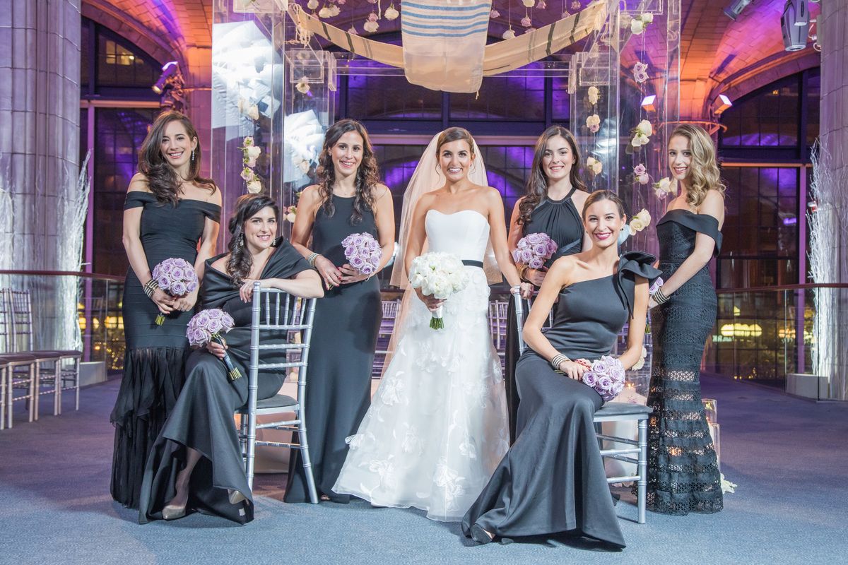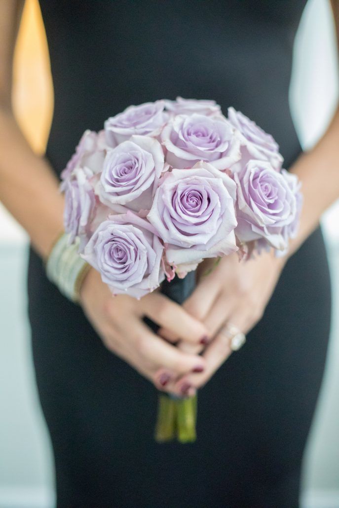 The bride’s modern and elegant style was sensed though out the wedding details, from the décor, styling, and fashion choices. Accentuating the floral motif of her dress, Madalyn’s all white bridal bouquet featured lush peonies, garden roses, and ranunculus. Her bridesmaids wore black striking dresses, each with a unique silhouette. They carried petite, hand-tied bouquets featuring ocean song roses in a silvery lavender hue.