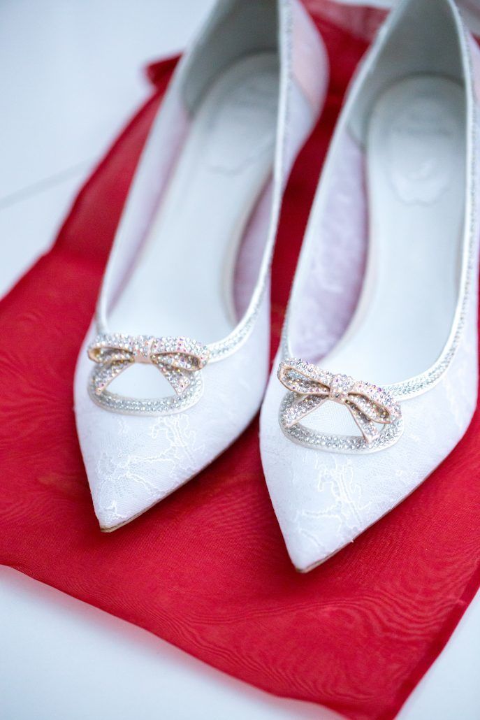 Madalyn wore the stunning Frieda gown by the legendary fashion designer. The design featured a sweetheart bodice of satin paired with a tulle skirt embellished with exquisite floral accents. Madalyn made the look all her own with the addition of one subtle, yet modern detail. “I also wanted to do something a little edgy and unexpected,” she says. “So I decided to add a black velvet sash around my waist, which was tied in a bow in the back.” Madalyn completed her bridal look with a pair of Rene Caovilla shoes made of delicate lace adorned with bejeweled bows.