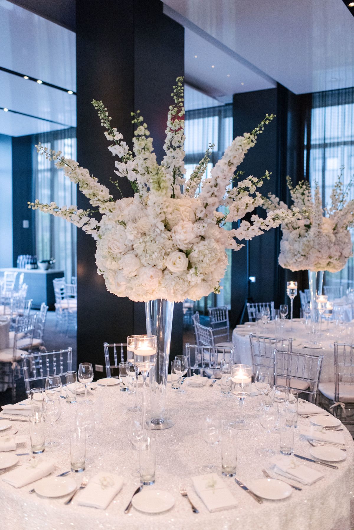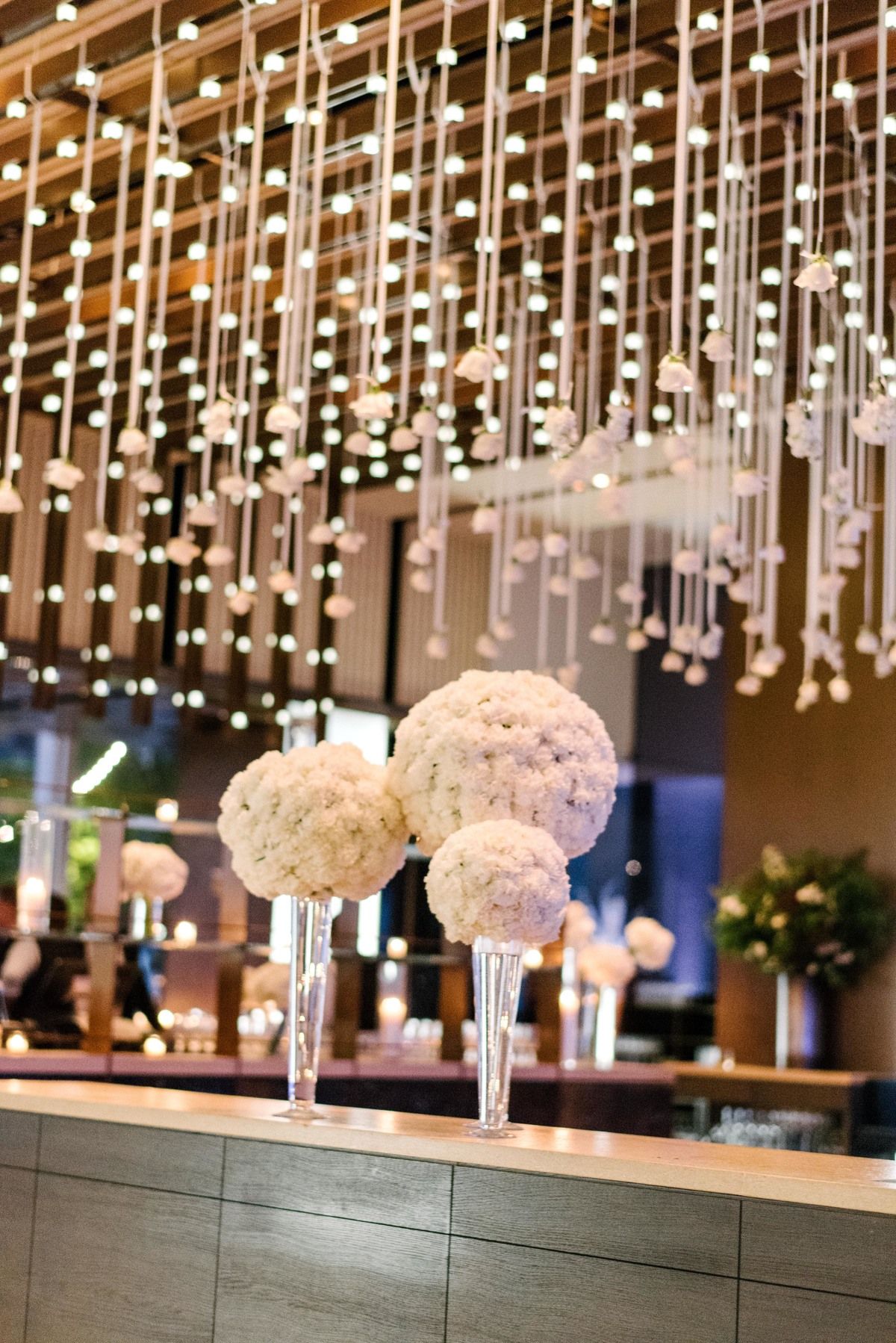 Sophia & Sam Wedding – High Centerpiece Calla Lily Hydrangea Kiwi Vine Phalaenopsis Orchid Garden Spray Rose Wisteria – Tribeca 360 NYC – by Shira Weinberger