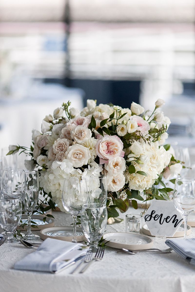 Emily & Daring Wedding – Low Centerpiece – Dahlia Eucalyptus Hydrangea Lisianthus Garden Spray Rose Ruscus – Battello – Photography by Casey Fatchett