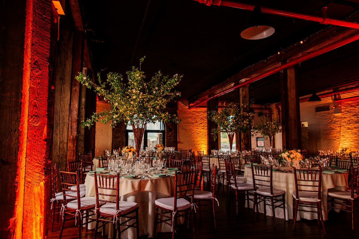 The reception hall featured dramatic high centerpieces of flowering white mock orange branches, in gorgeous contrast with the warehouse’s bare wood, exposed brick, and warm uplighting.