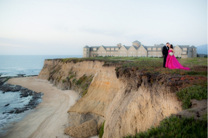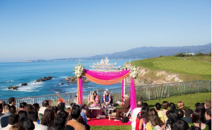 We love the bold, dramatic colors of Indian weddings, and this celebration in Half Moon Bay is no exception. Double points for BOTH of the bride’s hot pink dresses, with flowers to match!