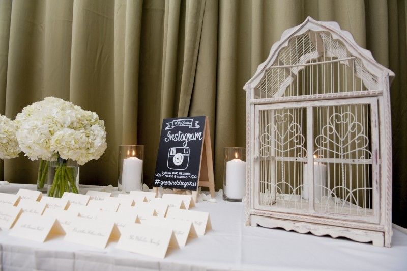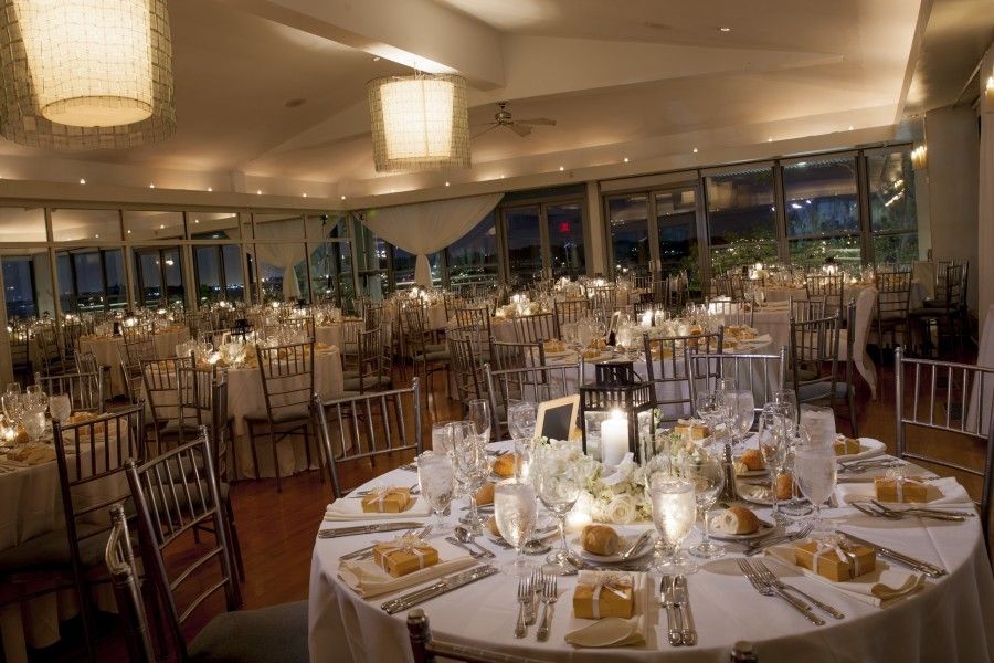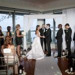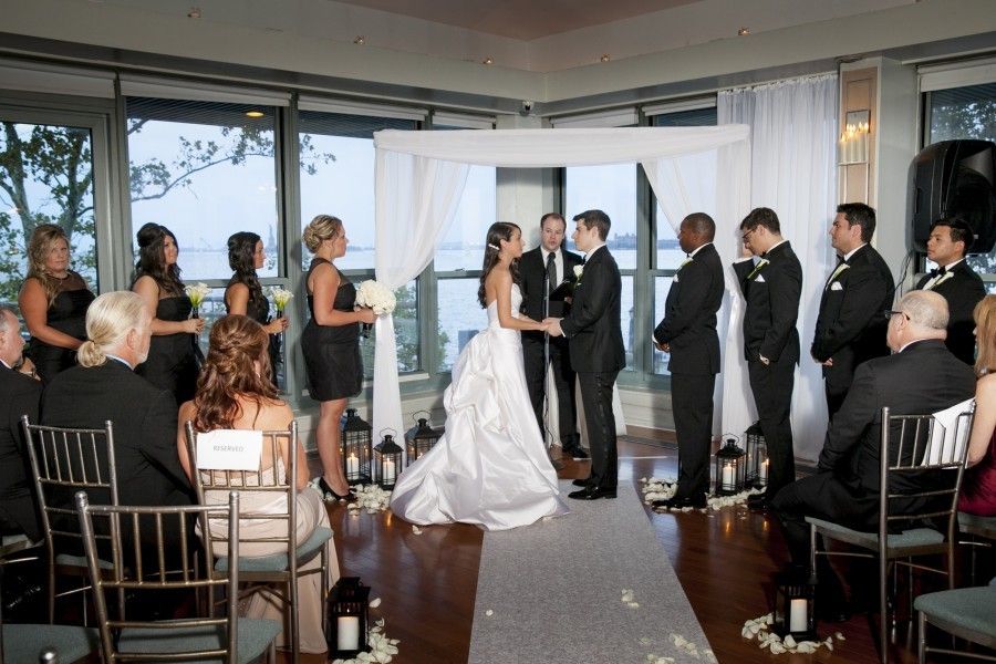 Katlyn and Phil’s wedding, at Manhattan’s Battery Gardens, was a study in chic minimalism. When we first spoke with this beautiful bride, she had a clear concept: simple elegance, with a black, white and champagne wedding-color scheme and all white wedding flowers. Her vision was well suited to Battery Gardens, a sophisticated Manhattan wedding venue with a stunning water view.