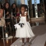 White hydrangea decorated the card table, and white dendrodium orchids, spray roses and stock were added to create the understated, low centerpieces for reception tables. But our very favorite part of this lovely wedding is the exuberant little flower girl! Her pure joy was captured perfectly by Brett Matthews Photography.