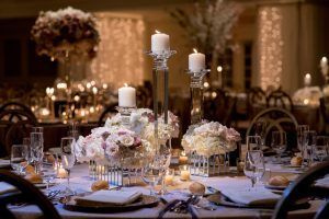 Danielle & Noah Wedding – Cold Spring Country Club NY – Low Centerpieces Roses Hydrangea Mirror Vases Crystal Candleholders -Photography by Brett Matthews