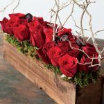 - Deep Red Roses Arrangement in Dark Stained Wood Trough via Olive & Cocoa