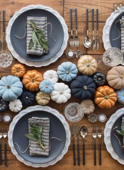 Vibrant fall colors are not for everyone, especially for an occasion like a wedding. If you share this same view, think about incorporating fall accents that are minimalist in style and neutral in color. A monochrome table arrangement featuring white pumpkins, naturally-shed antlers, dried hydrangea, and votive candles is contemporary, yet organic. A centerpiece featuring a cylinder vase filled with pinecones and Manzanita branches with hanging votives casts and enchanted mood. A runner made of pumpkins in shades of blue, white gold and orange crates a modern rustic look. Or do something totally unexpected and place white baby pumpkins and hydrangea in vintage silver vessels!