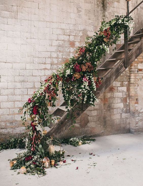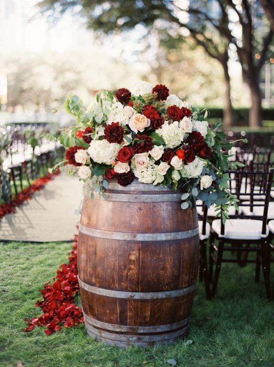 Ask any good wedding planner and they will tell you it’s the small, often surprising details that make a wedding really stand out. Ceremony décor accents such as a candlelit aisle or barrel filled with a voluminous display of blooms are sure to impress. A loose and natural floral garland in burgundy and blush sets a scene of autumnal romance.