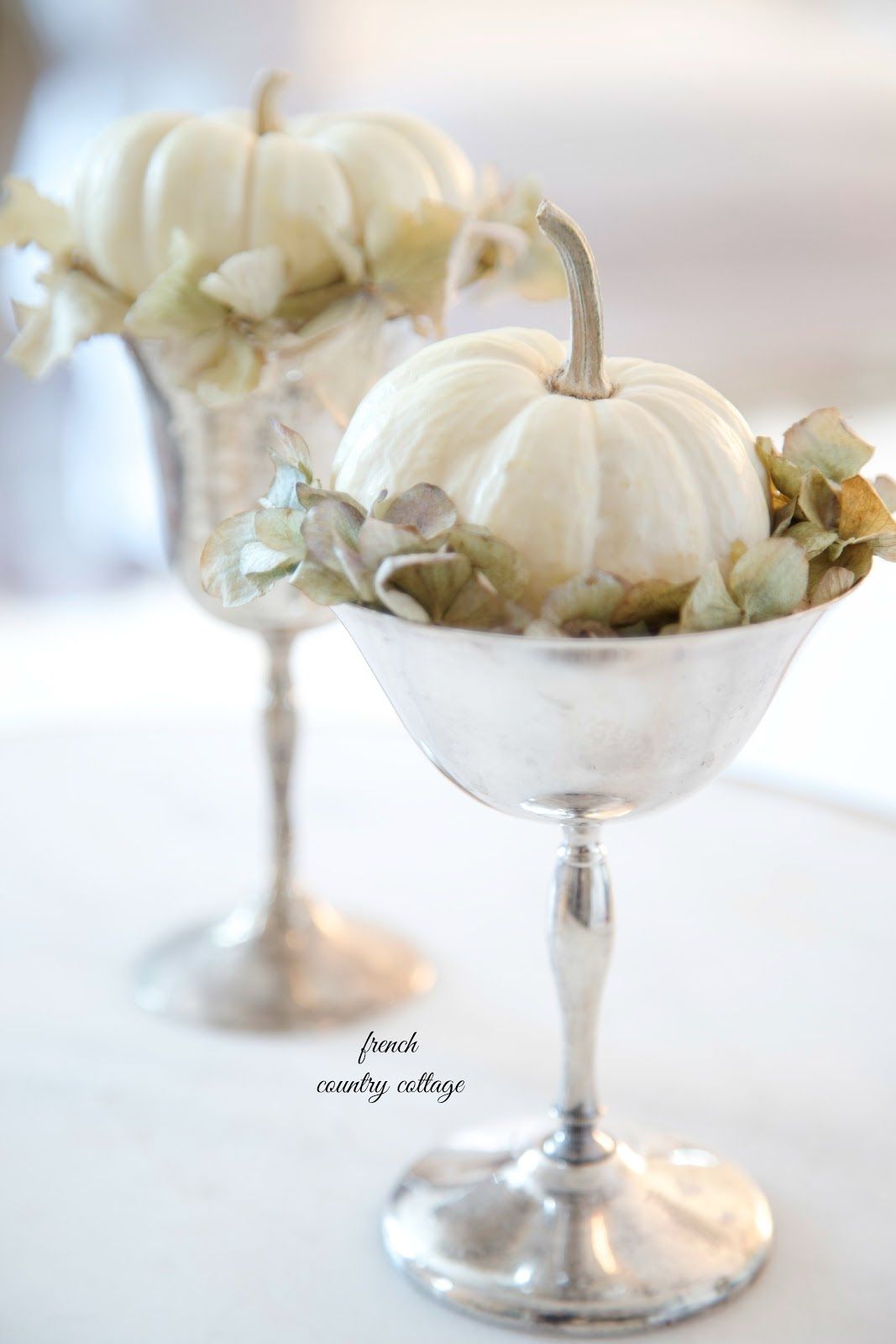 White Baby Pumpkins in Silver Goblets – via frenchcountrycottage.com