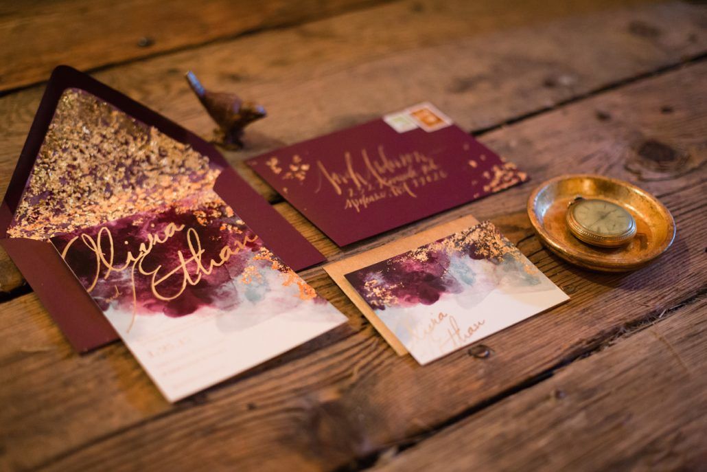 Burgundy Gold Wedding Invitation – via andrealeslieweddings.com