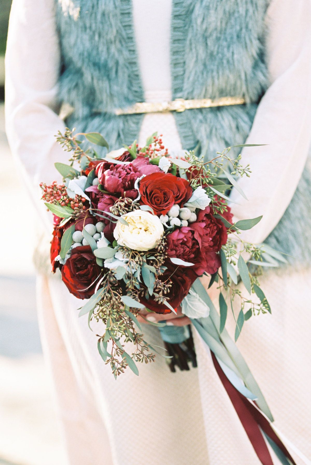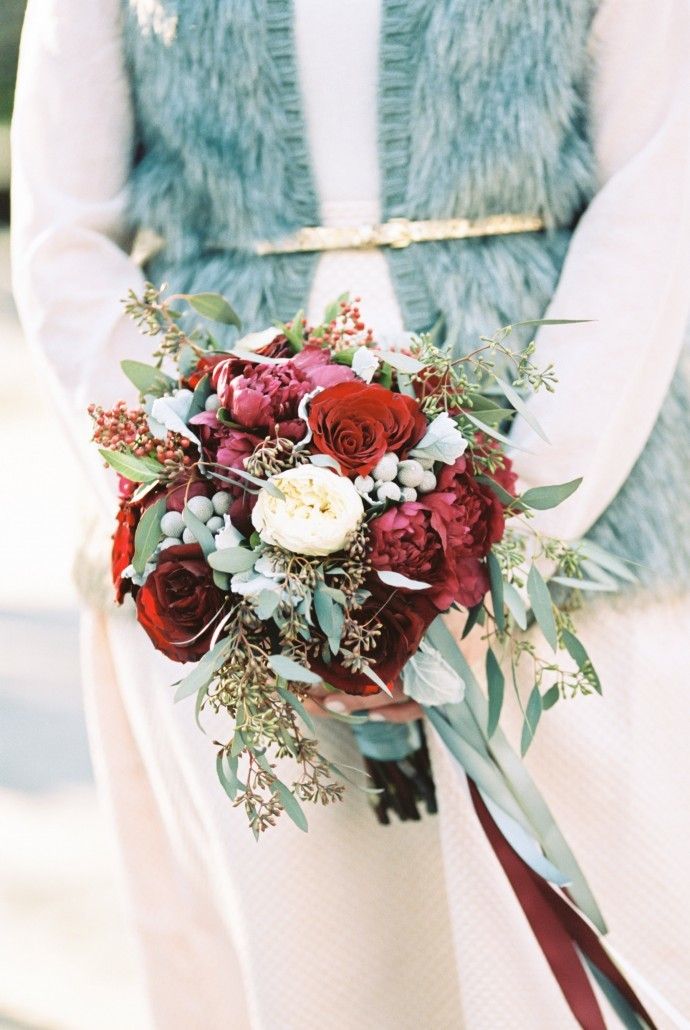 Once autumn begins, wedding floral arrangements tend to become looser and more natural in style. A combination of textures adds volume and dimension to the traditional, round hand-tied bouquet. Make a lovely impression with a bountiful mix of peonies and roses in lush red hues with touches of white complemented by berries and greenery.