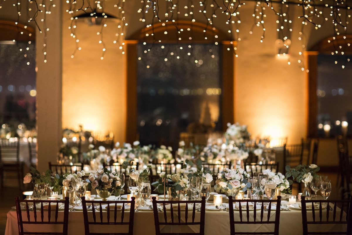 Use these elements with the addition of cream vendela roses, ivory spray roses, white peonies and ranunculus to create a striking tablescape. For a reception at the Liberty Warehouse , the mood was set by adorning the tabletop with low centerpieces in silver and rose gold mercury vases illuminated by the warm glow of votives.