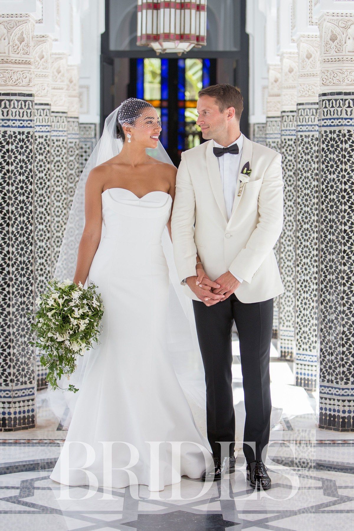 Hannah Bronfman wears many hats – Instagram It-Girl, HBFit founder, and DJ to name just a few. Her destination wedding to fellow DJ Brendan Fallis brought friends and family to Morcocco where they celebrated the couple over a lavish 4-day affair. Vows were exchanged in an outdoor ceremony at the historic hotel, La Mamounia where the bride stunned in a custom strapless silk crepe trumpet gown by Vera Wang, accented with a lace train embroidered with exquisite crystal and peal detail. A dramatic veil and lush bouquet completed her show-stopping attire.