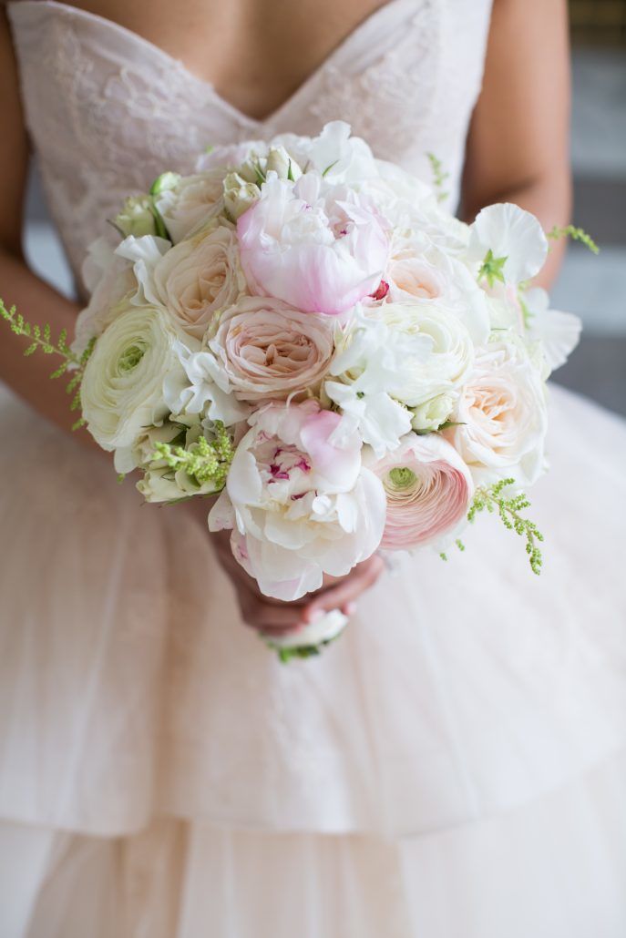 When it came time to choose florals, Jean drew from her bridal attire’s romantic and ethereal feel. Her bouquet featured Madylone peonies, O’Hara garden and majolica spray roses, ranunculus, astilbes, and sweet peas in soft shades of blush, ivory, and white.