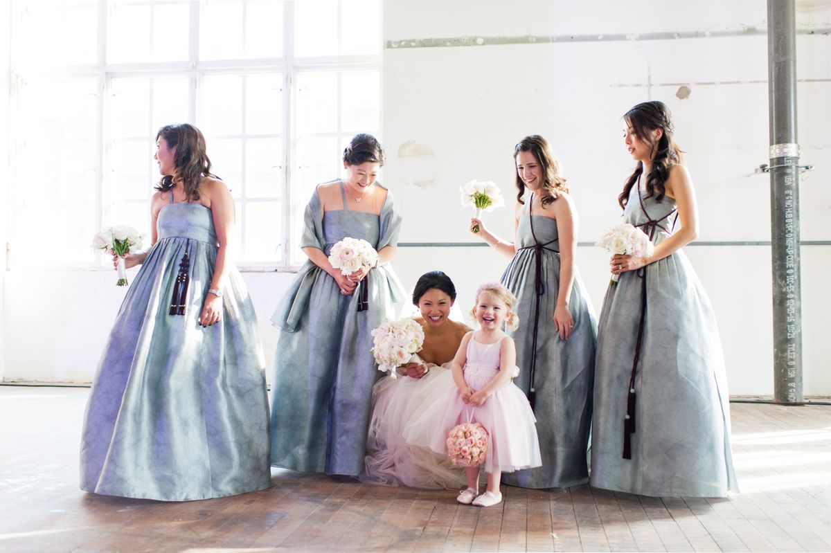 The bridal party also wore updated iterations of the traditional hanbok. “We picked the silk fabric together. Since the design was very simple, we decided to include an asymmetrical strap and matching decorative tassels as fun details. My sisters, who are more conservative, styled their tassels in a classic way to resemble a pendant. While my other bridesmaids tied the tassel in a really interesting pattern over the tops of their dresses, which ended up looking fashion-forward.”