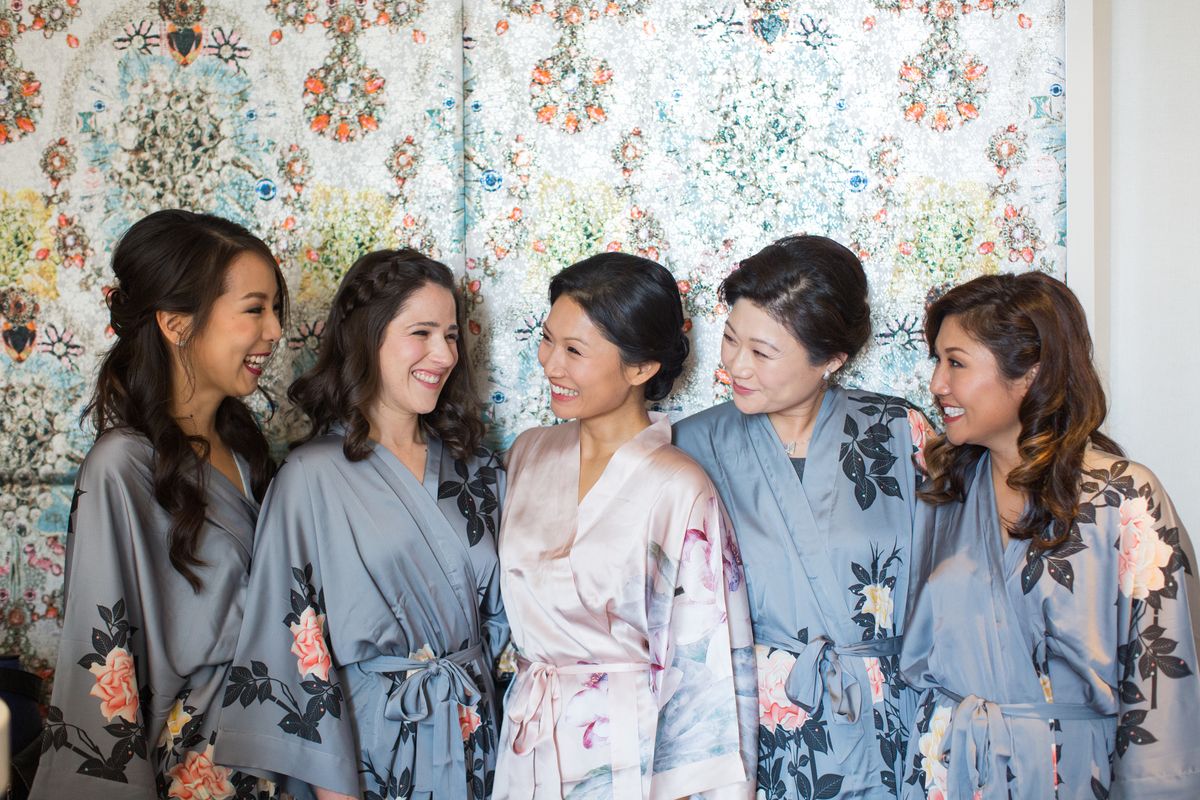 Jean and Bryan made sure to honor their shared Korean heritage in the celebrations. “We really wanted to incorporate our Korean background, in someway, through out the wedding. So Bryan and I each had our own hanbok, a traditional style Korean dress, custom made for the rehearsal dinner,” Jean explains. “They were modern versions though, and we each got to choose our own fabric and design, which was really cool.” Jean’s ensemble showcased a formal jacket paired with a beautiful soft pink gown featuring a bell-shaped silhouette. The next morning, the bride and her bridesmaids got ready while wearing gorgeous silk robes adorned with patterns inspired by traditional Chinese brushwork from Kim + Ono.