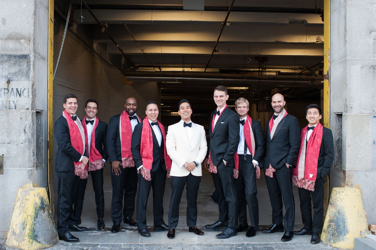 No stranger to fashion himself, Bryan looked most handsome in a custom designed Ermenegildo Zegna tuxedo featuring a stylish white jacket and black pant combo. “Bryan loves wearing scarves and he is a fan of Paul Smith and Shanghai Tang,” Jean says. “Since his groomsmen wore their own tuxes, Bryan gave each of them a scarf to help unify the party’s overall style. They were also made of a patterned red silk, which played into the Asian aesthetic and looked really nice with the hanbok.”