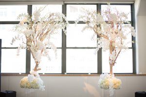 Sophia & Sam Wedding – Ceremony Trees Hydrangea Manzanita Dendrobium Phalaenopsis Orchid – Tribeca 360 NYC – by Shira Weinberger