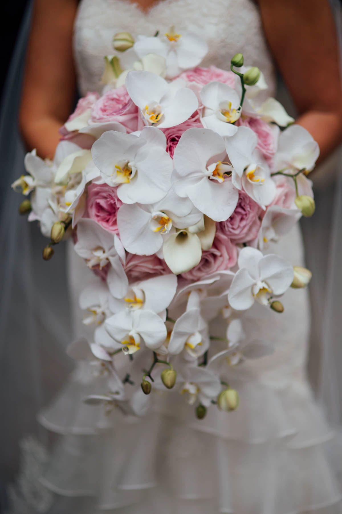 Orchid and Garden Rose Cascading Bouquet / Stephanie & David / Blue Hill Stone Barns / Photo by Ira Lippke Studios