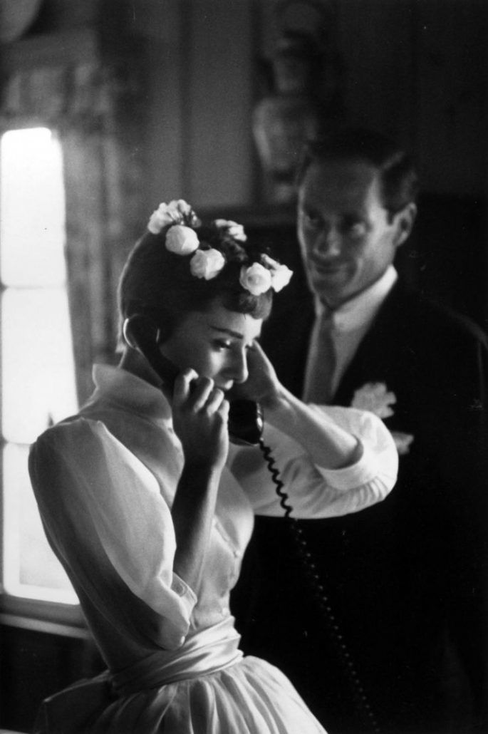 Audrey Hepburn married Mel Ferrer in a tea-length flared Balmain* dress with satin puffed sleeves and elbow length gloves, accompanied by a stunningly simple crown of roses. (*Yes, that’s the same Balmain responsible for Kim and Kanye’s cyborgian armor at this year’s Met Gala!)