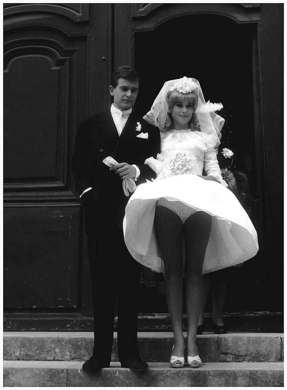 Catherine Deneuve married David Bailey in 1965, wearing peep-toe heels, a long sleeved bell dress and – evidently – white polka-dot panties. Besides reminding us to wary of a windy wedding, Catherine is rocking a statement floral headpiece gathered in the center and propping up her veil. If you’re considering a bold alternative to a circular crown, try a gathered pop of florals, either front & center or nudged to one side for a more casual, modern look.