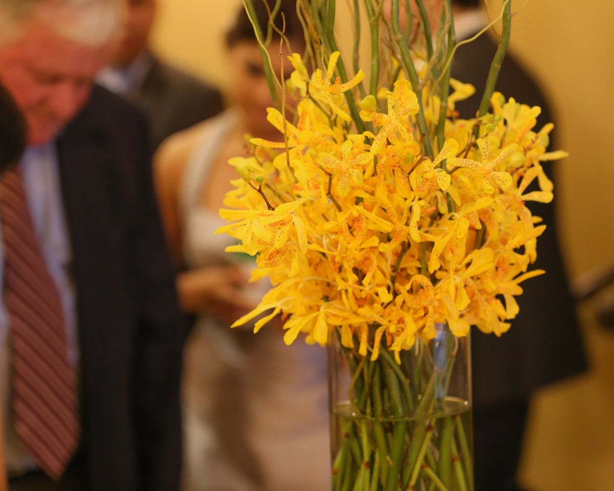 One beautiful way to work with a strong, striking shade is to use unusual blossoms while keeping the color scheme very simple. In this wedding, we used an abundance of bright yellow orchids for the bridesmaids’ bouquets, miniature yellow calla lilies for the groomsmen, and for the adorable flower girl, we made a perfectly round bouquet of yellow mums. Each mum held a tiny pearl in its center. For the bride, we stuck to white.