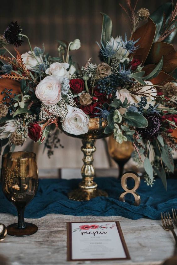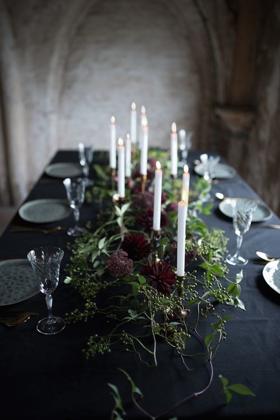 And don’t be “married” to the notion that you can only have white, green, and silver in your winter wedding decor. We are completely obsessed with the dark, moody color palette that emerged in fall. These wedding colors are showing no signs of going anywhere. Use deep berry and wine hues paired with gold accents in linens, tableware, and flowers of course! Taper candles add an enchanted grace that takes the style next level.