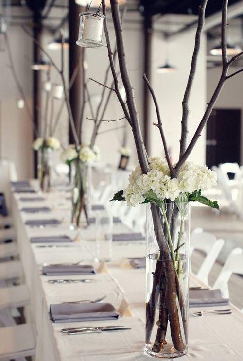 Branches have a ornanic look perfect for winter wedding decor. Arrange branches in tall cylinder vases and adorn with hydrangea and hanging votives for a one-of-a-kind table setting that captures the still beauty of the season.