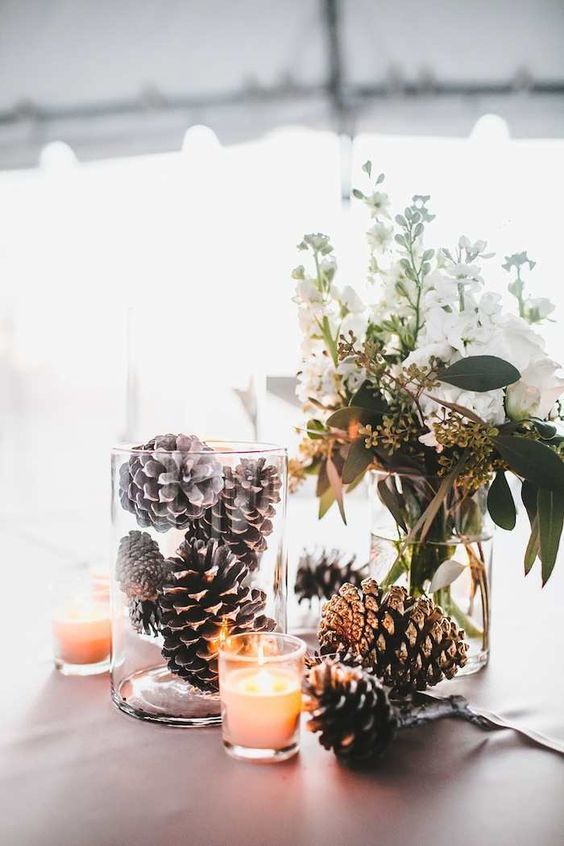 A winter wedding decor guide wouldn’t be complete without a pine cone or two. Create a charming centerpiece by filling glass vases with pine cones and fresh flowers illuminated by votives.