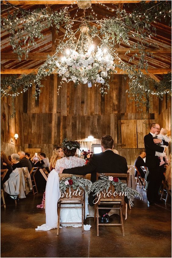 Getting married in a venue with a rustic, ranch-like atmosphere? Make the most of a cozy fireplace backdrop by adding romantic chiffon draping, suspended twig orbs adorned with twinkling lights, and a candlelit aisle to the space.