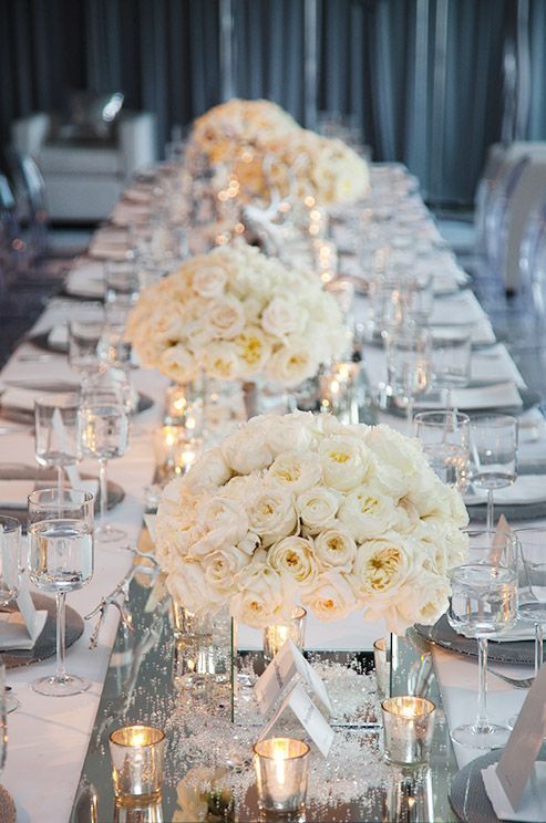 Mirror Runner with White Rose Centerpiece – via dearpearlflowers.com
