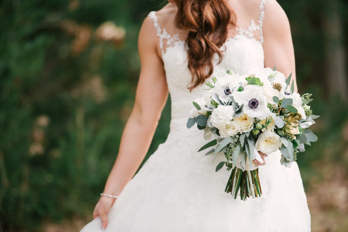 These pretty blooms add a beautiful touch to wedding bouquets. Anemones in shades of white and light pink bring a softness and look dreamy paired with light, neutral colored flowers and pale greenery accents. This lovely, natural looking arrangement features white anemones with cream and white vendela and garden roses, lisianthus, and geraniums with seeded eucalyptus, succulents, and scabiosa.