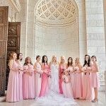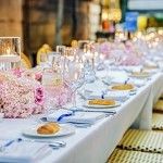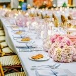 Lush reception tablescapes cast a rosy glow for the party, with blush and light-pink roses, Candy Bianca roses in the perfect shade of medium pink, and blush hydrangea. These long, low arrangements were surrounded with clusters of small white candles, floating in glass vases.
