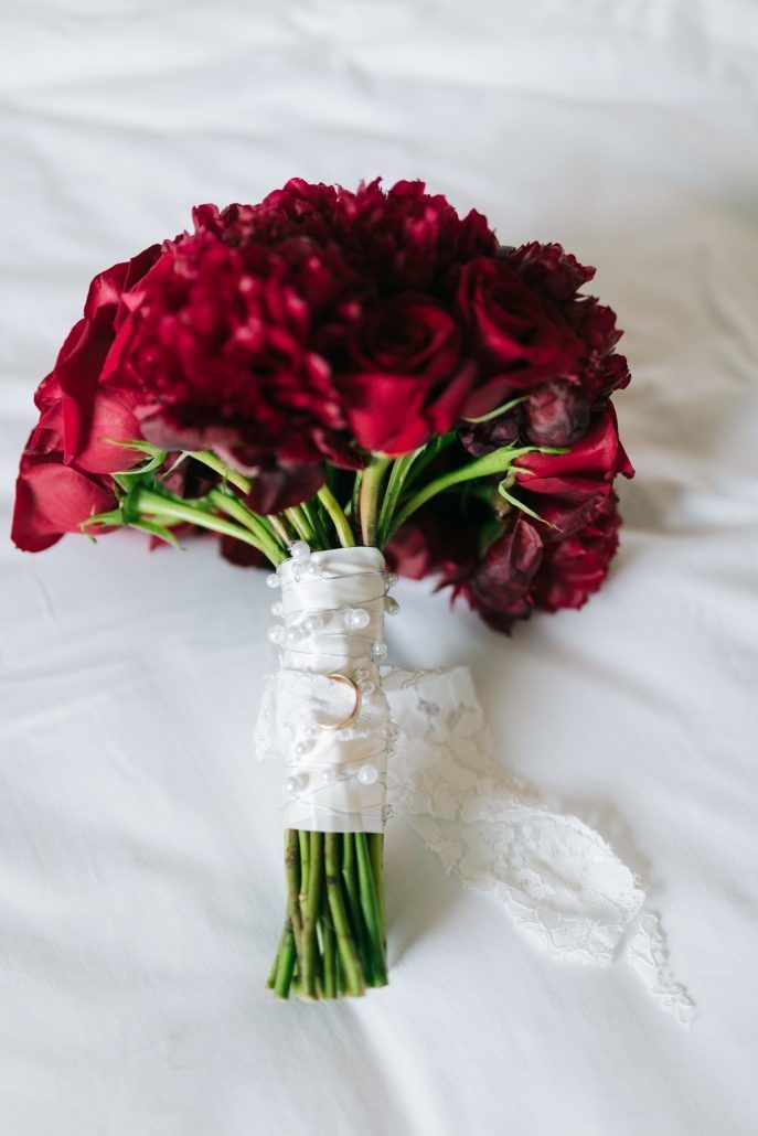 BB Featured Bride Lorenza remembered her late grandfather by tying his ring into the antique lace and ribbon that held together her red rose and peony bouquet. “He was the only grandparent who couldn’t be there. To honor him by having his wedding wedding band with me at my own wedding was very special.”
