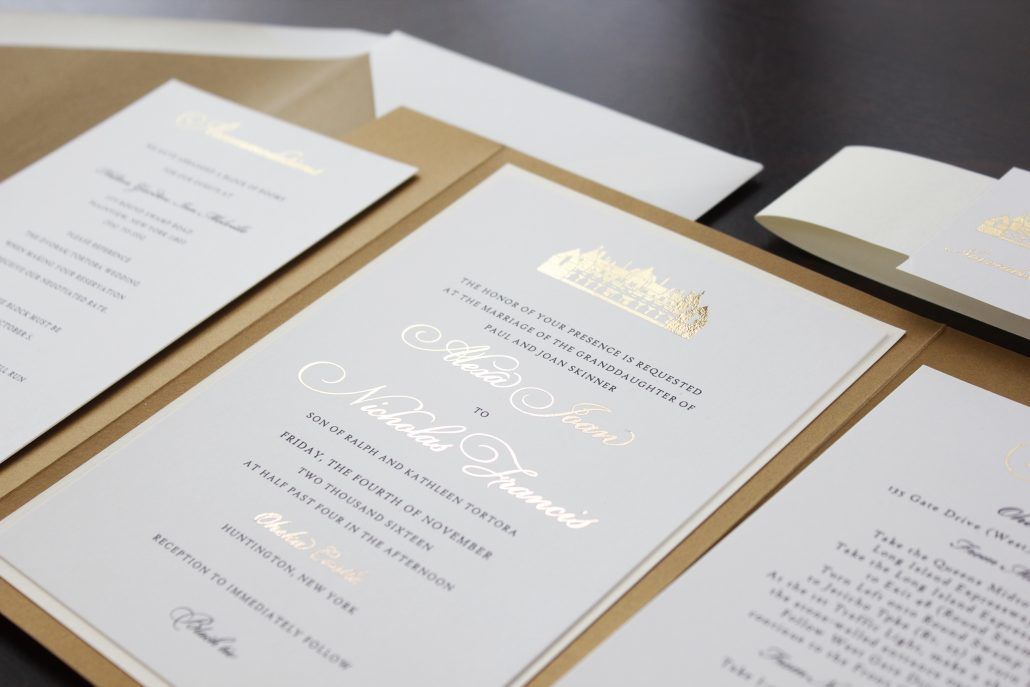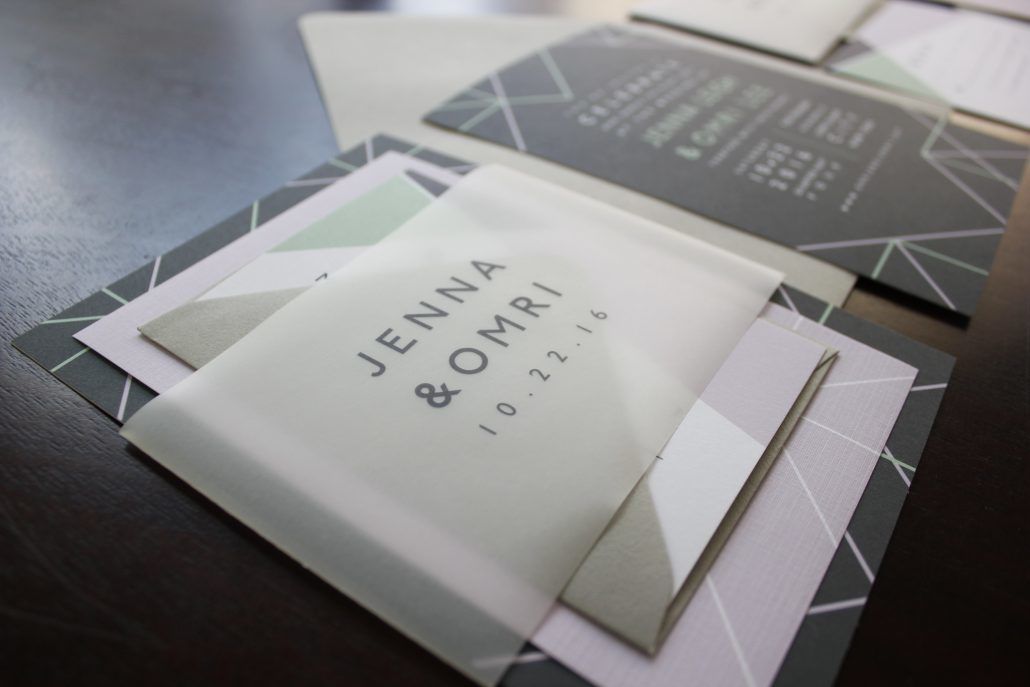 I start with a simple questionnaire; I ask for the couple’s favorite activities together, their lifestyle, and how they met. Then I get the details on their wedding: Why they chose their venue, how they want their wedding to feel, colors and décor inspiration, and I ask them to share a Pinterest board if they have one. From there, I go to work on three “First Looks”, which are essentially three (usually very different) first drafts. I ask the couple to give me feedback on what they like and don’t like from each one and we start to hone in on their unique design. For custom designs, I always offer unlimited edits, because I think when people are limited in the number of changes they can request it puts them under a lot of unneeded pressure. Some people just don’t have an instinct for design, and they need to see something to believe it’s not going to look good, even if I tell them that’s what I think. Once the graphic elements of the suite are approved, I provide three physical proofs with three different versions of packaging, and encourage the couple to “mix and match” to create their finished product. That’s my favorite part!