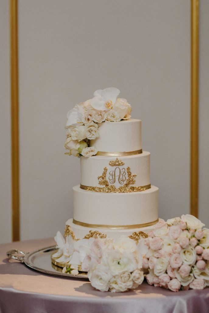 OH, these are two favorites for different reasons! For Jessica, we really pulled in all of the ornate detailing of the Versailles Ballroom of the St. Regis. We gave two of the tiers accents of molded gum paste painted in gold along with the custom monogram and then did simple gold painted banding on the other layers. For the flowers, Jessica opted for fresh flowers, which we coordinated with you, Bride & Blossom, by sharing sketches for placement and delivery timing to have everything come together seamlessly! I know some bakers frown upon fresh flowers on wedding cakes, but it’s really a great budget-friendly alternative. And they can be so lovely!!